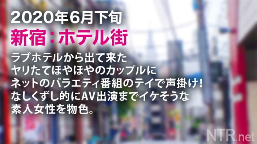 【NTR=寝取られ・寝取り】このAVは素人カップルと男優の背徳まみれSEXを撮影してカップルの心情を追うNTRドキュメント企画AVです。新宿のラブホ街で声をかけたこのカップル。元読者モデルをしていた時に、彼と出会ったのだそう。付き合って半年のラブラブカップルです。話を聞いた後にAVの出演を持ち掛けてみると、ノリ気の彼氏に対し出演を渋る彼女。とりあえず後日改めて決めてもらう約束に。後日会って是非を伺ってみると、最初は納得してない様子でしたが、彼氏にいくつかのワガママを聞いてもらう事を条件に出演を決めてくれました。ホテルで待ち合わせをして、いよいよ撮影スタートです!恒例のボディチェックをしていると、なんともセクシーなTバック!変な下着は見せられないから若干気を使った、という彼女。なんともいじらしい彼女さんです。緊張でガチガチのようでしたが、電マでオマ○コを刺激するとすっかりトロトロに。あまりの気持ちよさに何度も昇天!潮吹いて身体をビクつかせながらイキまくる姿に、思わず胸に手を当てて見守る彼氏さん。最後は何度も繰り返される激しいピストンに息も絶え絶えになりながらフィニッシュ。ヘロヘロになりながらお風呂場へ向かう彼女に、感想を伺うついでにおかわりの2回戦。最後は膣奥目がけてフィニッシュし、満足気な彼女は満面の笑みを浮かべておりました!